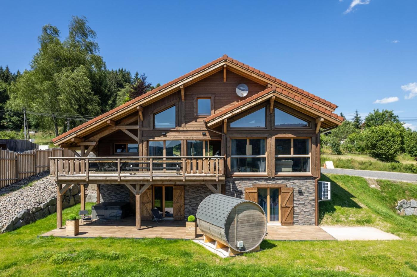 Chalet. This luxurious chalet features a hot tub, a sauna and a fireplace. This spacious chalet is comprised of 1 living room, 5 separate bedrooms and 3 bathrooms with a walk-in shower and free toiletries. Guests will find a stovetop, a refrigerator, a dishwasher and kitchenware in the well-fitted kitchen. The chalet also has a barbecue. Featuring a terrace with garden views, this chalet also offers a washing machine and a flat-screen TV with satellite channels. The unit offers 10 beds.