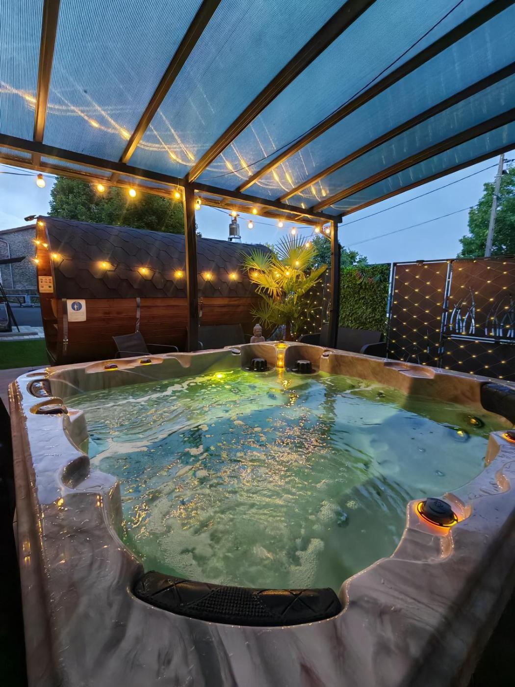 Eight-Bedroom House. The hot tub and sauna are the standout features of this holiday home. The holiday home has 8 bedrooms, 2 bathrooms and a kitchen. The holiday homes kitchen is available for cooking and storing food. Boasting a terrace with garden views, this holiday home also offers a washing machine and a flat-screen TV. The unit has 11 beds.