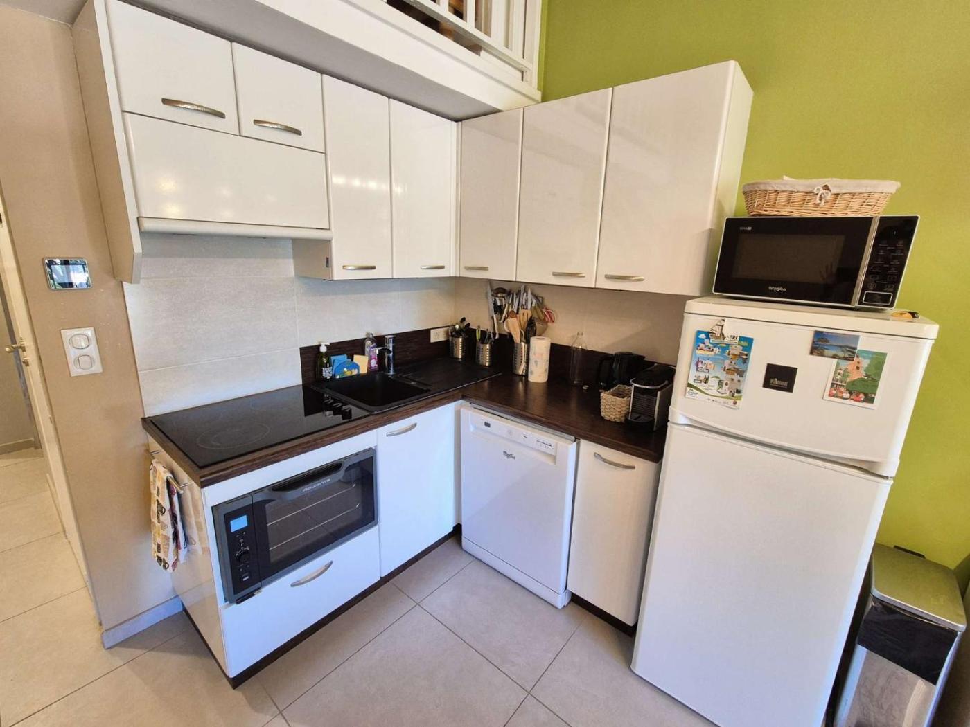 The apartment is composed of 2 separate bedrooms, a living room, a fully equipped kitchenette with a dishwasher and microwave, and 1 bathroom.