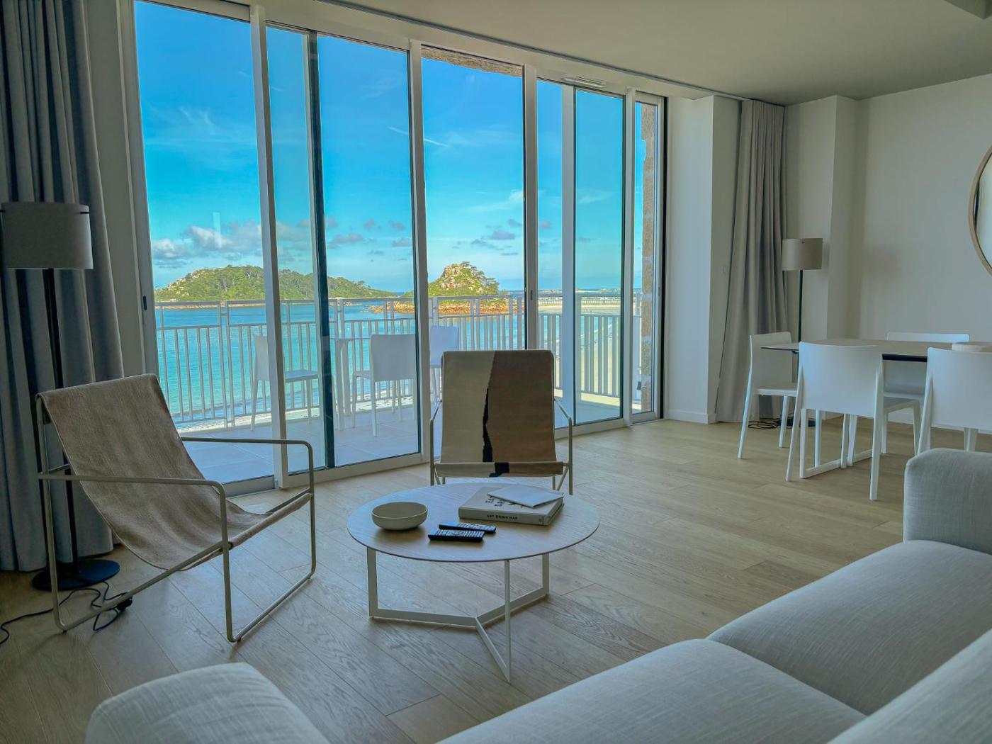 Two-Bedroom Deluxe Apartment with Ocean View. This apartment features a private pool. Boasting a private entrance, this spacious apartment also features 2 separate bedrooms and 3 bathrooms with a bath and a shower. Guests can make meals in the kitchen that has a stovetop, a refrigerator, a dishwasher and kitchenware. The apartment has a washing machine, a tea and coffee maker, tumble dryer as well as a terrace with sea views. The unit has 3 beds.